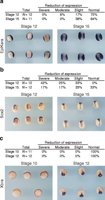 hace1 has a role in regulating differentiation into neural ectoderm. aâc HACE1 MO (15 ng) was injected into the animal region of the right dorsal blastomere, and control MO (15 ng) was injected into that of the left dorsal blastomere at the 4-cell stage. Embryos were fixed at the stages indicated, and expression of epidermal keratin, an epidermal ectoderm marker (a), sox2, a neural ectoderm marker (b), and Xbra, a mesodermal marker (c), were analyzed by in situ hybridization. Representative images from two independent experiments are shown (lower panels) |