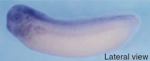 hace1 (HECT domain and ankyrin repeat containing E3 ubiquitin protein ligase 1) gene expression in Xenopus tropicalis embryo, assayed via in situ hybridization, NF stage 28, lateral view, anterior left, dorsal up. |