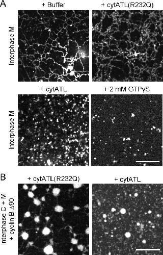 Figure 2—figure supplement 1. ER network formed with Xenopus extract fractions is disassembled by ATL inactivation.(A) An ER network was generated with interphase light membranes. Buffer, 2 µM cytATL, 2 µM cytATL R232Q, or 2 mM GTPγS were added subsequently and the membranes were stained with octadecyl rhodamine. (B) A mitotic ER network was formed from the interphase cytosol and light membranes by the addition of non-degradable cyclin B∆90. After addition of 2 µM cytATL or 2 µM cytATL R232Q, the membranes were stained with octadecyl rhodamine. Scale bars = 20 µm.DOI: