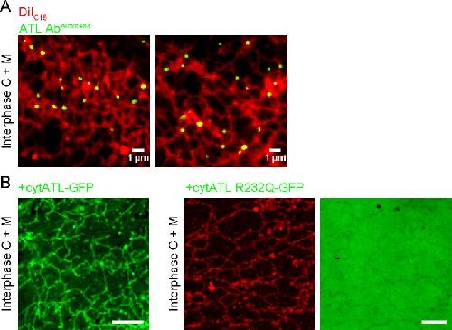 Figure 5—figure supplement 1. Localization of endogenous and inactivated ATL in a Xenopus ER network.(A) An interphase ER network was generated with cytosol, DiIC18-prelabeled light membranes, and an energy regenerating system. Endogenous ATL was visualized by including 10.5 nM Alexa488-labeled, affinity-purified antibodies against Xenopus ATL. The sample also contained sperm chromatin to stabilize the network by reducing thermal convection. Scale bars = 1 µm. (B) A mixture of interphase cytosol, light membranes, and an energy regenerating system was incubated in the presence of 0.5 µM cytATL-GFP, but absence of membrane stain,for 30 min (left panel). Parallel reactions were performed with 2 µM cytATL(R232Q)-GFP and the membrane stain octadecyl rhodamine (middle and right panels). Scale bars = 10 µm.DOI: