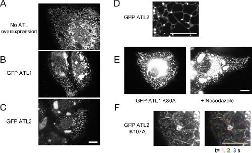 http://dx.doi.org/10.7554/eLife.18605.003Figure 1—figure supplement 1. Effect of ATL overexpression on ER morphology in U2OS cells.(A) Image of a whole U2OS cell expressing GFP-calreticulin. (B) As in (A), but a cell expressing GFP-ATL-1. (C) As in (A), but a cell expressing GFP-ATL-3. Scale bar = 10 µm. (D) Peripheral ER network in a U2OS cell stably expressing GFP-tagged ATL-2. Scale bar = 10 µm. (E) Image of a U2OS cell expressing GFP-ATL-1 K80A, untreated (left panel) or treated with 1 µM nocodazole for 90 min (right panel). Scale bar = 10 µm. (F) Peripheral ER network in a U2OS cell stably expressing a GTPase-defective mutant of ATL-2 (GFP-ATL-2 K107A). The right panel shows three time points. Stationary pixels appear white, while those moving appear in colors. Scale bar = 10 µm.DOI: