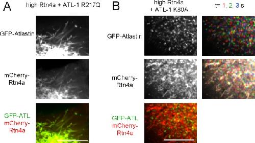 http://dx.doi.org/10.7554/eLife.18605.018Figure 7—figure supplement 1. Co-overexpression of ATL mutants and Rtn4a in U2OS cells.(A) Peripheral ER network in a U2OS cell expressing a high level of mCherry-tagged Rtn4a and GFP-ATL-1 R217Q, a dimerization defective mutant. Scale bar = 10 µm. (B) Peripheral ER network in a U2OS cell expressing a high level of mCherry-tagged Rtn4a and GFP-ATL-1 K80A, a GTPase defective mutant. The second column shows three time points for both the ATL and Rtn channels. Stationary pixels appear white, while those moving appear in colors. Scale bar = 10 µm.DOI: