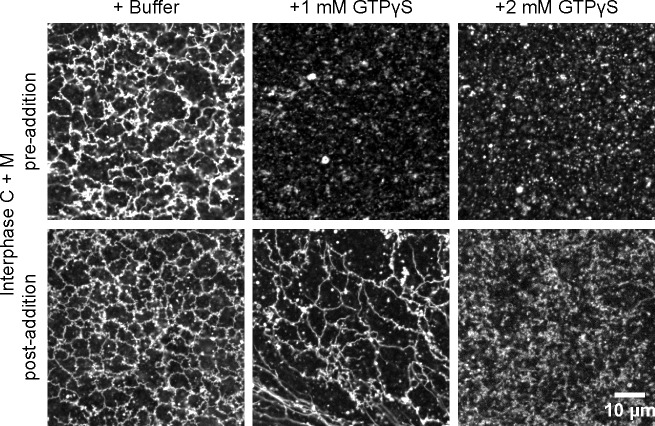 Figure 6—figure supplement 1. ER network maintenance is less sensitive to ATL inhibition than ER network formation.GTPγS was added at 1 mM or 2 mM either before (upper panels) or after (lower panels) formation of an ER network from Xenopus egg cytosol (C), light membranes (M), and an energy regenerating system. The membranes were stained with octadecyl rhodamine. Scale bar = 10 µm.DOI: