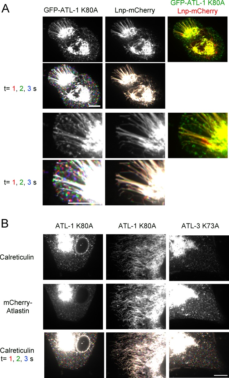 Figure 10—figure supplement 1. ATL acts upstream of Lnp in U2OS cells.(A) Peripheral ER in U2OS cells stably expressing Lnp-mCherry and GFP-ATL-1 K80A (GTPase defective mutant). The second and fourth rows show three time points. Stationary pixels appear white, while those moving appear in colors. The top five panels depict two entire cells, while the bottom five panels show magnifications of the peripheral ER of these cells. Scale bars = 10 µm. (B) Peripheral ER in Lnp-lacking U2OS cells expressing GFP-calreticulin. The cells also stably express mCherry-tagged ATL mutants defective in GTPase activity. The bottom row shows three time points. Scale bar = 10 µm.DOI: