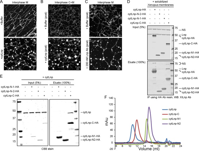 http://dx.doi.org/10.7554/eLife.18605.027Figure 11—figure supplement 1. Cytoplasmic fragments of Lnp interfere with the function of endogenous Xenopus Lnp.(A) Light membranes (M) were incubated with an energy regenerating mix and either buffer or 5 µM cytLnp for 15 min. The membranes were stained with octadecyl rhodamine. Scale bar = 5 µm. (B) Buffer or 5 µM of cytLnp was added to a preformed network formed from cytosol (C) and membranes (M). Scale bar = 5 µm. (C) Buffer or 200 nM of affinity-purified Lnp antibody was added to a preformed network formed from membranes only. Scale bar = 5 µm. (D) Interaction of endogenous Xenopus egg Lnp with various Lnp fragments. A detergent extract of light membranes was incubated with empty resin or hemagglutinin (HA)-tagged Lnp fragments (see Figure 11A). After pull-down with HA antibodies, the bound fractions were analyzed by immunoblotting with antibodies to Xenopus Lnp. (E) Interaction of purified Xenopus cytLnp with various cytLnp fragments. HA-tagged Lnp fragments (see Figure 11A) was incubated with cytLnp, and subsequently HA antibodies. Bound fractions were analyzed by SDS-PAGE and stained with Coomassie blue. (F) Purified cytLnp or fragments of it (see Figure 11A) were analyzed by gel filtration on a Superdex 200 column.DOI:
