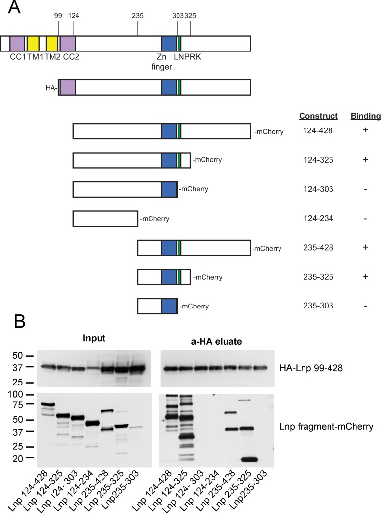 http://dx.doi.org/10.7554/eLife.18605.023Figure 9—figure supplement 1. Lnp-Lnp interaction is mediated by the Zn2+-finger domain-containing region.(A) Schematic representation of Lnp truncation mutants tested for interaction. Hemagglutinin (HA)-tagged Lnp 99–428 was used as bait for pull-downs of mCherry-tagged truncations. (B) Immunoblots of co-immunoprecipitation experiments. Each of the mCherry-tagged fragments and the HA-tagged bait were expressed separately in 293T cells. Cells were lysed, and the levels of mCherry-tagged truncations were normalized according to fluorescence at 590 nm, except Lnp 235–303 which was poorly expressed. After mixing with lysate containing HA-Lnp 99–428, pull-downs were performed with HA-antibodies and the samples were analyzed by immunoblotting with HA- and mCherry- antibodies.DOI: