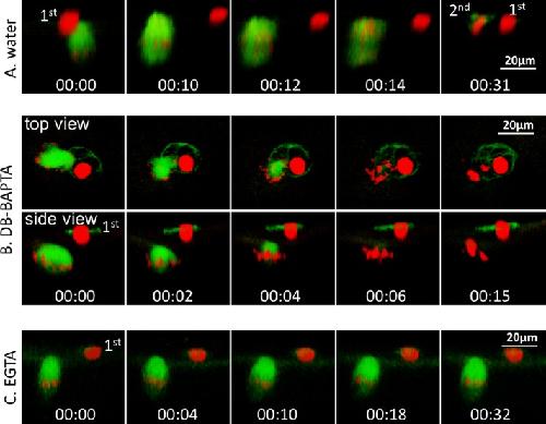FIGURE 5:. Both DB-BAPTA and EGTA buffers inhibited egg activation, but only DB-BAPTA caused collapse of metaphase II spindle. (A) Time series (side view) of a mature egg injected with 30 nl of water, followed immediately by time-lapse imaging (00:00), depicting anaphase (00:12) and emission of the second polar body (00:31). This series is composed of three image segments of the same oocyte, necessitated because significant cortical contraction required repositioning of the oocyte. (B) Time series of a mature egg injected with 30 nl of 25 mM DB-BAPTA (00:00), followed by immediate time-lapse imaging, depicting the lack of egg activation (no cortical contraction) but rapid collapse of metaphase II spindle. (C) Time series (side view) of a mature egg injected with 30 nl of 25 mM EGTA (00:00), followed by immediate time-lapse imaging, depicting no cortical contraction or changes of metaphase II spindle.