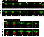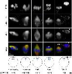 FIGURE 7:. Colocalization of calmodulin with spindle microtubules during polar body emission. Typical confocal images of oocytes fixed at the indicated stages, stained with anti-calmodulin and anti-tubulin, and counterstained with DAPI. The projection orientation is indicated for each oocyte, where the xy-plane is parallel to the oocyte surface and z is perpendicular, pointing toward the center of the oocyte. The approximate time (minutes from GVBD) of each stage is indicated at the bottom. E, early (prometaphase); red, tubulin; green, calmodulin; blue, DNA.