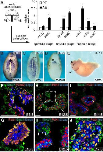 of setd7 (B,E), pdx1 (C) and insulin (D) expression in cross-sectioned Xenopus