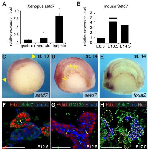 Setd7 in the mouse foregut endoderm (E8.5) and pancreatic rudiments at indicated stages. Data