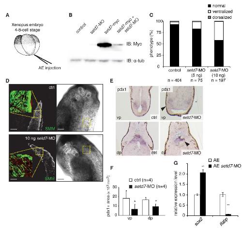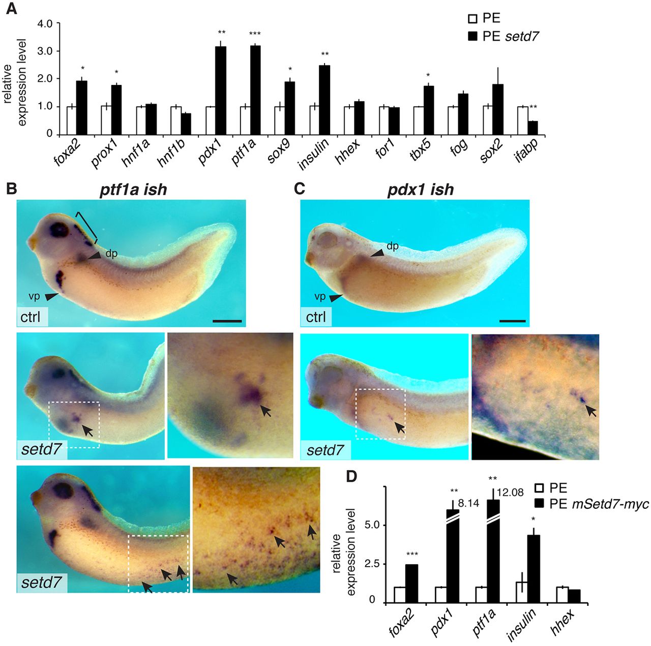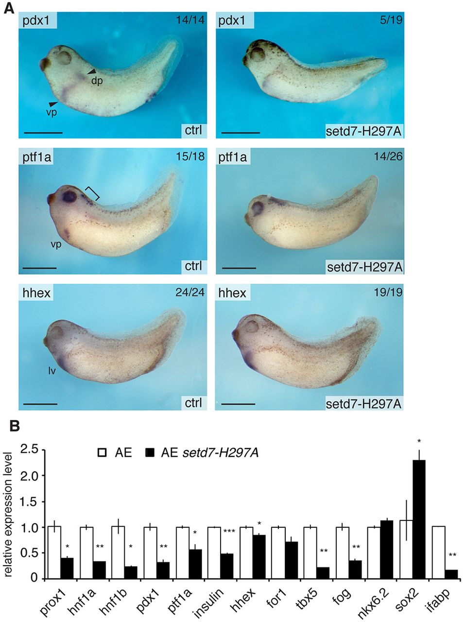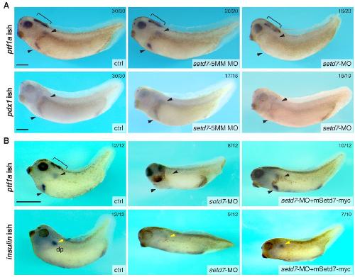uninjected (ctrl) and setd7-MO-injected (5 ng) Xenopus embryos. Arrowheads indicate dorsal (dp) and ventral pancreatic (vp) buds. Brackets indicate ptf1a