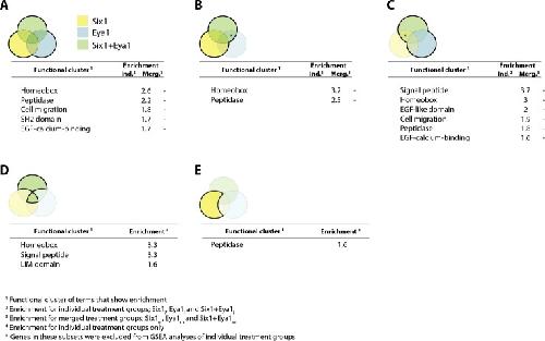 Figure 3. Gene set enrichment analysis (GSEA) showing enriched clusters of functional terms for up-regulated genes in different treatment groups.In each case, treatment groups considered are highlighted and outlined in bold in the accompanying Venn diagram. Yellow colouring indicates Six1 treatment; blue shows Eya1 and green Six1+Eya1. Enrichment scores â¥1.5 are reported for individual treatment groups (Ind.) and, where available, â¥0.5 for merged treatment groups (Merg.). (A) Up-regulated genes from all treatment groups included in analysis; (B) Six1 overexpression only; (C) Eya1 overexpression only. (D) Genes differentially expressed after overexpression of both Six1 and Eya1; (E) exclusively after Six1 overexpression; (F) exclusively after Eya1 overexpression.DOI: http://dx.doi.org/10.7554/eLife.17666.005Figure 3âfigure supplement 1. Gene set enrichment analysis (GSEA) showing enriched clusters of functional terms for down-regulated genes in different treatment groups.In each case, treatment groups considered are highlighted and outlined in bold in the accompanying Venn diagram. Yellow colouring indicates Six1 treatment; blue shows Eya1 and green Six1+Eya1. Enrichment scores â¥1.5 are reported for individual treatment groups (Ind.) and, where available, â¥0.5 for merged treatment groups (Merg.). (A) Down-regulated genes from all treatment groups included in analysis; (B) Six1 overexpression only; (C) Eya1 overexpression only. (D) Genes differentially expressed after overexpression of both Six1 and Eya1; (E) exclusively after Six1 overexpression.DOI: http://dx.doi.org/10.7554/eLife.17666.006 |