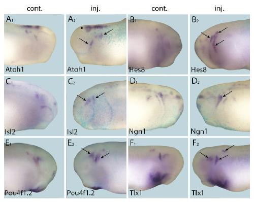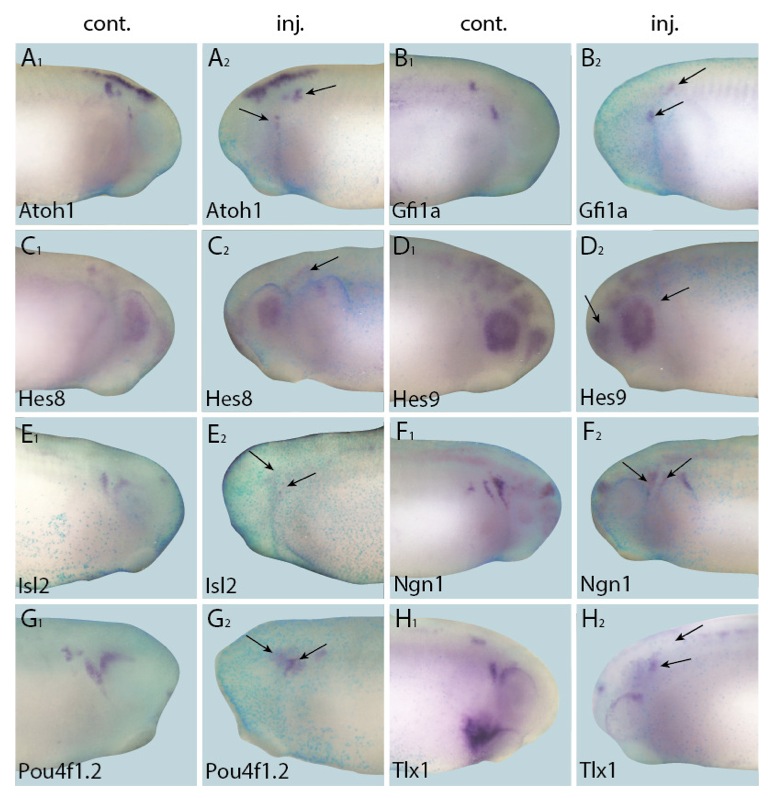 Figure 8. Down-regulation of target gene expression domains after overexpression of Six1. Tail bud stage embryos (AâH) after unilateral injection of Six1-GR and DEX induction at neural plate stage (16â18). In each case, lacZ was co-injected as a lineage tracer and panels A1âH1 show the control (un-injected) side and A2âH2 show the injected side. Arrows mark reductions in marker gene expression in placodal derivatives. |