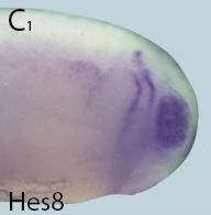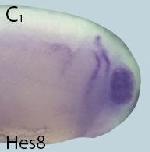 hes8 (hairy and enhancer of split 8) gene expression in Xenopus laevis embryo, assayed via in situ hybridization, NF stage 24, lateral view, anterior right, dorsal up. |