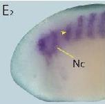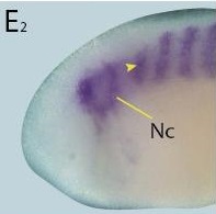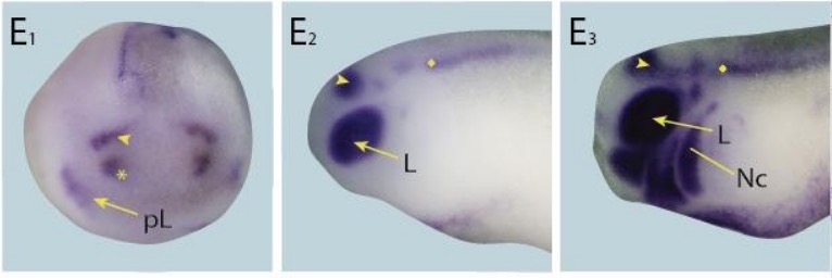 mab21l2 (mab-21-like 2l) gene expression in Xenopus laevis embryo, at NF stage 18/19 (E1), NF stage 24 (E2) and NF stage 28 (E3), assayed via in situ hybridization. key: pL: lens placode; L. lens; Nc; neural crest; arrowheads: midbrain; diamond: spinal cord |