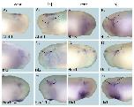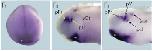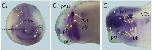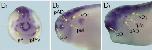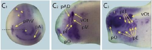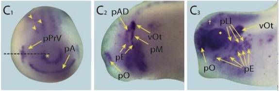 hes5.4 (hairy and enhancer of split 5 gene 4) gene expression in Xenopus laevis embryo, at NF stage 18/19 (C1), NF stage 24 (C2) and NF stage 28 (C3), assayed via in situ hybridization. key: pPrzV profundal/trigeminal placodes; pA anterior placodal area; pAD anterior lateral line placode; pE: epibranchial placode; pO: olfactory placode; vOt: otic vesicle; pLl: lateral line placodes;pM: middle lateral line placode |