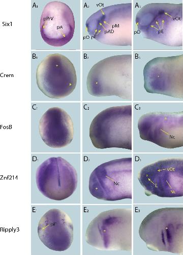 Figure 4âfigure supplement 2. Expression of targets that broadly overlap with PPE in whole-mount Xenopus embryos. Expression dynamics for each target are shown across a range of developmental stages: A1âE1 show expression in neural plate stage embryos, A2âE2 show early tail bud stage embryos and A3âE3 show late tail bud stage embryos. (A) Expression of PPE marker gene Six1 is shown as reference for placodal domains (for details see Pandur and Moody, 2000; Schlosser and Ahrens, 2004). (B) Crem is initially expressed broadly in paraxial mesoderm (B1; asterisk) and cranial ectoderm (B1; arrowhead) at neural plate stages and in pharyngeal arches and overlying ectoderm at early and late tail bud stages (B2 and B3 ; diamond). (C) FosB is expressed in a broad pattern across the cranial ectoderm and trunk mesoderm at both neural fold and early tail bud stages (C1 and C2). At late tail bud stages expression is maintained in cranial ectoderm as well as becoming apparent in the migrating neural crest cells (Nc) and weakly in the somites (C3; arrowhead). (D) Znf214 is expressed broadly across the ectoderm at all developmental stages (D1âD3). At both early and late tail bud stages there is expression in the migrating neural crest cells (Nc) as well as in the retina (D2 and D3; asterisk), and in late tail bud stages Znf214 is expressed in the otic vesicle and lens. (E) Ripply3 is expressed broadly in the posterior placodal region at neural fold stages (E1). At both early and late tail bud stages expression is confined to posterior cranial ectoderm (E2 and E3; asterisk). Yellow arrows mark placodal expression. Abbreviations: pA: anterior placodal region; pAD: anterior lateral line placode; pE: epibranchial placode; L: lens; pM: middle lateral line placode; pO: olfactory placode; vOt: otic vesicle; pP: posterior placodal region; pPrV: profundal/trigeminal placodes. |