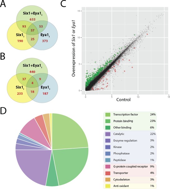 Figure 2. Differentially expressed genes after overexpression of Six1 and Eya1 in the PPE.Plots A and B show number of genes differentially regulated after overexpression of Six1 alone (Six1i; yellow), Eya1 alone (Eya1i; blue) or Six1 and Eya1 combined (Six1+Eya1i; green). Each Venn diagram shows the number of genes (red) unique for each treatment group or shared between them. (A) Number of genes up-regulated and (B) down-regulated after injection with Six1, Eya1 or Six1+Eya1. (C) The merged analysis resulted in hundreds of significantly differentially expressed genes in the PPE data set. Plot shows log2 transformed (FPKM+1) values after overexpression of Six1 or Eya1 (combination of all treatment groups; Six1+Eya1m). Green points represent significantly (q<0.05) up-regulated genes and red points show significantly down-regulated genes. Plot D shows the enrichment of molecular function terms after overexpression of Six1 or Eya1 based on significantly differentially expressed genes from the merged data set (Six1+Eya1m; Supplementary file 3, Table 5). The area of the pie represents the total number of functional terms contained in the analysis, with each slice representing the percentage of genes against this total. Molecular functions shown can be broadly divided into five categories: Green slices are related to binding functions (53%); purple/blue represents enzyme activity (30%); pink/red shows transmembrane proteins (13%); orange cytoskeleton (3%) and yellow anti-oxidant (1%).DOI: http://dx.doi.org/10.7554/eLife.17666.004 |
