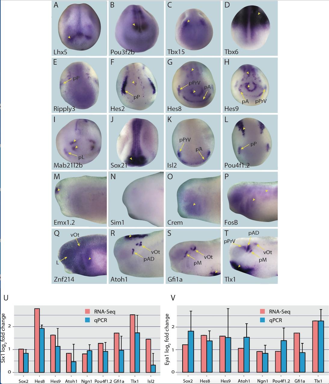 Figure 4. Expression of selected presumptive direct targets of Six1/Eya1 in whole-mount Xenopus embryos. Genes expressed at neural plate stages (stages 14â18) are shown in panels AâL, and those only expressed at later stages are shown at mid/late tail bud stage (stages 28â32) in panels MâT. Several of the genes surveyed (Lhx5, Pou3f2b, Tbx15, Tbx6, Emx1.2 and Sim1 (AâD, M and N), were not expressed in the PPE, nor any placodal derivatives in later stages. Instead, such genes were expressed in the adjacent neural folds (Lhx5, Pou3f2b and Tbx15), ectoderm (Tbx6), or in the forebrain at later stages (Emx1.2). Several other genes were expressed broadly across the cranial ectoderm, at least partially overlapping with the PPE at neural plate stages (Ripply3, Crem, FosB and Znf214; E,OâQ), some of which are also maintained in placodal derivatives such as Znf214 in the otic vesicle (Q). The remaining genes (FâL, RâT) are expressed in parts of the PPE and maintained in some placodes (Hes2, Hes8, Hes9, Mab21l2b, Sox21, Isl2, Pou4f1.2, and Tlx1) or are expressed in a subset of placodes only (Atoh1, Gfi1a) (see Figure 4âfigure supplements 1â4 for additional stages). Yellow arrows mark placodal expression. Arrowheads mark non-placodal expression. Abbreviations: pA: anterior placodal region; pAD: anterior lateral line placode; pE: epibranchial placode; pL: lens placode; L: lens; pM: middle lateral line placode; pO: olfactory placode; pP: posterior placodal region; pPrV: profundal/trigenimal placodes; vOt: otic vesicle. Plots U and V show qPCR after Six1 or Eya1 overexpression. Log2 fold change values were calculated from qPCR data obtained after overexpression of Six1-GR (U) or Eya1-GR (V) in placodal explants and are shown next to corresponding fold change values obtained from the RNA-Seq data. In all cases shown, qPCR values broadly corroborate those from the RNA-Seq data - showing up-regulation of target genes after either Six1 or Eya1 overexpression. Vertical error bars show the standard deviation of the mean of biological triplicates. |