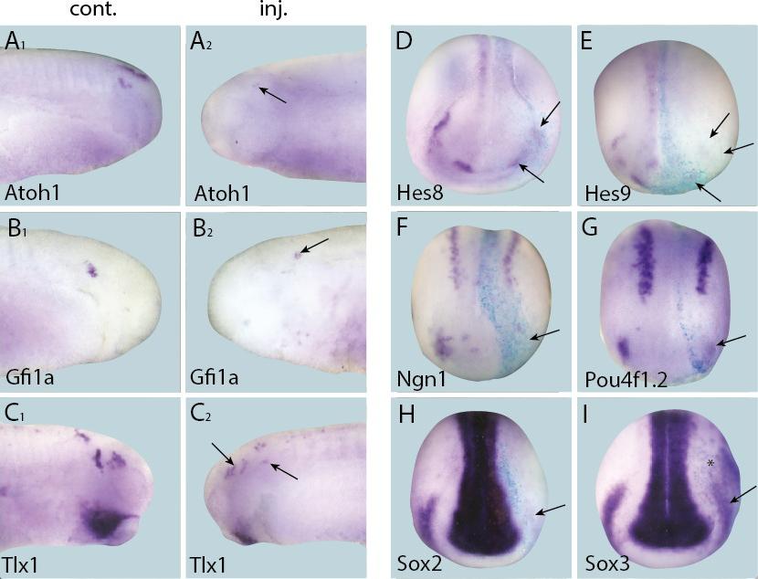 Figure 5âfigure supplement 2. Repression of Six1 target genes by Six1-EnR injection.Tail bud stage (AâC) and neural plate stage (DâI) embryos after unilateral injection of Six1-EnR. In each case, lacZ was co-injected as a lineage tracer and panels A1âC1 show the control (un-injected) side and A2âC2 show the injected side. The injected side is positioned to the right in DâI, as marked by blue lacZ staining (lacZ staining out of frame in some specimens). Arrows mark reductions in marker gene expression in placodal derivatives, and asterisks indicate increased expression.DOI: http://dx.doi.org/10.7554/eLife.17666.017 |