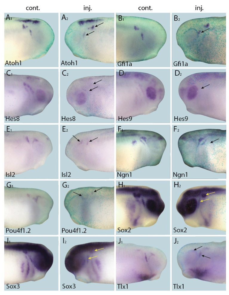 Figure 9. Down-regulation of target gene expression domains after overexpression of Eya1. Tail bud stage embryos (AâJ) after unilateral injection of Eya1-GR and DEX induction at neural plate stage (16â18). In each case, lacZ was co-injected as a lineage tracer and panels A1âJ1 show the control (un-injected) side and A2âJ2 show the injected side. Arrows mark reductions in marker gene expression in placodal derivatives. |
