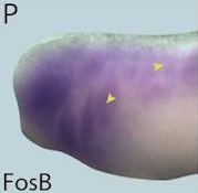 fosb (FBJ murine osteosarcoma viral oncogene homolog B ) gene expression in Xenopus laevis embryo, assayed via in situ hybridization, NF stage 24, lateral view, anterior left, dorsal up. |