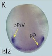 isl2 (ISL LIM homeobox 2) gene expression in Xenopus laevis embryo, assayed via in situ hybridization, NF stage 24, lateral view, anterior left, dorsal up. |