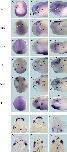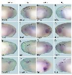 Figure 4âfigure supplement 3. Expression of targets with dynamic/transient expression pattern in placodes in whole-mount Xenopus embryos. Expression dynamics for each target are shown across a range of developmental stages: A1âE1 show expression in neural plate stage embryos, A2âE2 show early tail bud stage embryos and A3âE3 show late tail bud stage embryos. (A) Expression of PPE marker gene Six1 is shown as reference for placodal domains (for details see Pandur and Moody, 2000; Schlosser and Ahrens, 2004). (B) Hes2 is expressed very strongly in a broad region corresponding to the posterior placodal domain including the prospective otic and lateral line placodes, as well as weakly in a scattered subset of neuroectodermal cells (B1; asterisk) at neural plate stages (see Figure 4âfigure supplement 5 for section). Expression is later restricted to the otic vesicle and a new expression domain becomes established in the developing retina at early and late tail bud stages (B2 and B3; arrowhead). (C) During neural plate stages (C1), Hes8 is expressed in the developing profundal and trigeminal placodes as well as in the anterior placodal region, the anterior neural plate (C1 ; asterisk) and the primary neurons (motor neurons, intermediary neurons and sensory neurons) of the posterior neural plate (C1; arrowheads; see Figure 4â figure supplement 5 for section). In early tail bud stages (C2) trigeminal expression is lost and replaced by expression in the otic vesicle, as well as lateral line, epibranchial and olfactory placodes. Throughout late tail bud stages (C3), expression is maintained in these regions and the brain (C3; cross) and is initiated in the retina (C3; diamond). (D) During neural plate stages (D1), Hes9 is expressed in the developing profundal and trigeminal placodes as well as in the anterior placodal region, the anterior neural plate (D1; asterisk) and the primary neurons (motor neurons, intermediary neurons and sensory neurons) of the posterior neural plate (D1; arrowheads; see Figure 4âfigure supplement 5 for section). In early tail bud stages (D2) trigeminal expression is lost but expression is apparent in the olfactory placodes, as well as in the otic and lateral line placodes and retina (D2; diamond). In late tail bud stages (D3) Hes9 is expressed broadly thoughout the brain (D3 ; cross), and is maintained in the lateral line and olfactory placodes as well as the otic vesicle. (E) During neural plate stages (E1), Mab21l2b is expressed in the prospective lens placode, as well as in the eye field (prospective retina) of the forebrain (E1; asterisk) and the prospective midbrain (E1; arrowhead). At early tail bud stages expression in the lens and midbrain is maintained and its expression becomes apparent in the hindbrain (E2; diamond). In late tail bud stages Mab21l2b is additionally prominently expressed in migrating neural crest cells (E3 ; Nc). (F) During neural plate stages Sox21 is expressed broadly throughout the anterior neural plate (F1; asterisk). At early tail bud stages (F2), this expression becomes confined to the forebrain (asterisk in F2) and midbrain-hindbrain boundary (arrowhead in F2) and is maintained into late tail bud stages, (F3). In late tail bud stages, Sox21 is also expressed in the olfactory placode, otic vesicle and becomes up-regulated in the hindbrain (F3; diamond). Yellow arrows mark placodal expression. Dotted lines in B1âD1 indicate levels of sections shown in Figure 4âfigure supplement 5. Abbreviations: pA: anterior placodal region; pAD: anterior lateral line placode; pE: epibranchial placode; pLl: lateral line placodes; L: lens; pL: lens placode; pM: middle lateral line placode; pO: olfactory placode; vOt: otic vesicle; pP: posterior placodal region; pPrV: profundal/trigeminal placodes. |
