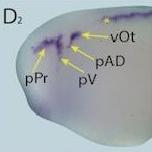 hes5.7 (hairy and enhancer of split 5, gene 7) gene expression in Xenopus laevis embryo, at NF stage 18/19 (D1), NF stage 24-28 (D2) and NF stage 28/30 (D3), assayed via in situ hybridization. KEY: pA: anterior placodal area; pAD: anterior lateral line placode; pM: middle lateral line placode; pO: olfactory placode; vOt: otic vesicle; pPrV: profundal/trigeminal placodes. |