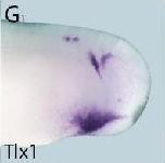 tlx1 (T cell leukemia homeobox 1) gene expression in Xenopus laevis embryo, assayed via in situ hybridization, NF stage 24, lateral view, anterior right, dorsal up. |