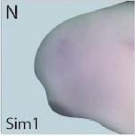 sim1 (SIM bHLH transcription factor 1) gene expression in Xenopus laevis embryo, head region, assayed via in situ hybridization, NF stage 28, lateral view, anterior left, dorsal up. |