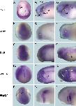 Figure 7. Up-regulation of target gene expression domains after overexpression of Eya1. Tail bud stage embryos (AâG) after unilateral injection of Eya1-GR and DEX induction at neural plate stage (16â18). In each case, lacZ was co-injected as a lineage tracer and panels A1âG1 show the control (un-injected) side and A2âG2 show the injected side. Arrows and arrowheads mark expansions in marker gene expression in placodal and non-placodal derivatives, respectively. |