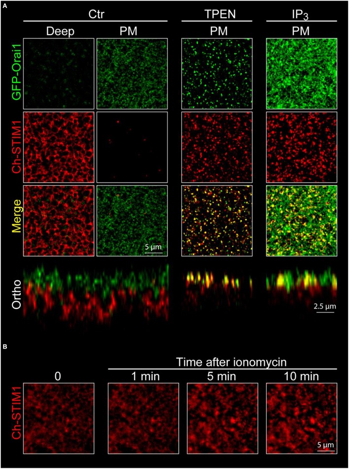 Figure 4. Confocal imaging of STIM1 and Orai1 in Xenopus oocytes. (A) Confocal z-stacks are obtained from oocytes overexpressing mCherry tagged STIM1 (Ch-STIM1) and GFP-Orai1. The pinhole aperture is set to 1 Airy unit and the images are taken every 0.5 μm. Two selected planes are illustrated, the Plasma Membrane (defined as the maximum expression level of GFP-Orai1) and the intracellular/ER compartment (Deep) approximately 10 μm deep in the cell and at the maximum of Ch-STIM1 expression in control conditions (Ctr). Treatment of the cells with TPEN (5 mM, 10 min), IP3 (2.5 μM final) induces the translocation of Ch-STIM1 to the plasma membrane and the co-clustering of the proteins, visible as dense yellow dots in the merged images. Below each panel (Ctr and TPEN) is an orthogonal reconstitution (Ortho) of a plane perpendicular to the membrane illustrating the distribution of both proteins across the z-axis. (B) Timeline of the formation of Ch-STIM1 clusters following application of ionomycin (10 μM). The images are captures using an open pinhole aperture on the confocal to compensate for the vertical movement of STIM1.