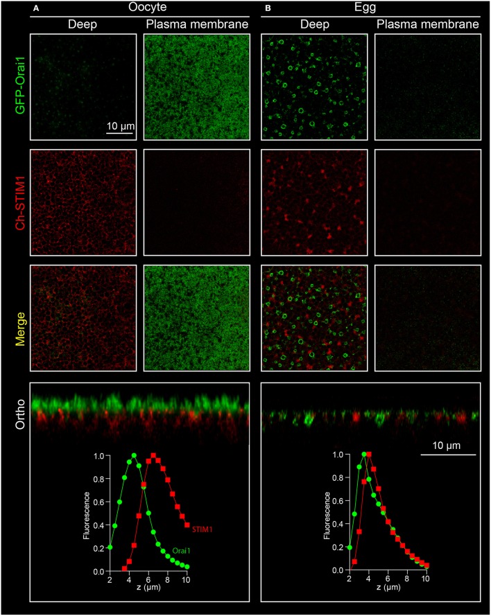 Figure 5. Orai1 internalization during meiosis. Confocal stacks are performed on oocytes (A) and eggs (B) expressing both STIM1-Ch and Orai1-GFP. Oocyte maturation is associated with internalization of Orai1. This is visible as the removal of Orai1 from the plasma membrane in the oocyte and its enrichment in an endosomal compartment in confocal sections (deep), on the orthogonal reconstruction (ortho) and on the fluorescence curves as a shift of the Orai1 intensity curve toward the ER as marked by STIM1.