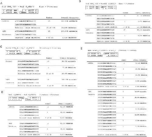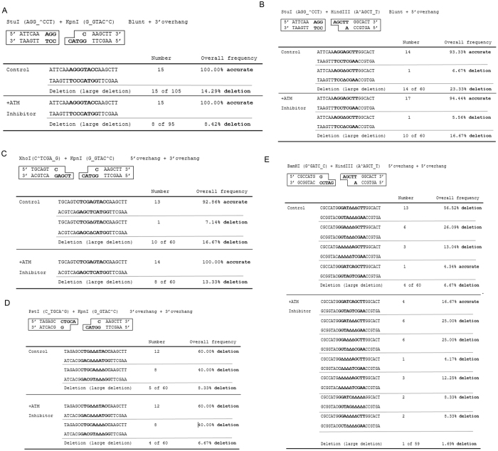 Figure 4. Processing of non-compatible ends is flexible and specific to the structure of DSB ends.Various NHEJ repair templates with non-compatible ends, as in Fig. S2, were incubated in Xenopus egg extracts, re-isolated, and transformed into bacteria cells. Final repair products were isolated and subjected to sequencing analysis. The NHEJ templates include: blunt/3′-overhang (A), blunt with 5′-overhang (B), 3′-overhang/5′-overhang (C), 3′-overhang/3′-overhang (D), and 5′-overhang/5′-overhang (E). The repair assay was performed with or without ATM inhibitor as in Fig. 3B. In each reaction, approximately 15–20 final repair products were sequenced and shown. Nucleotides deleted during DNA repair were indicated by empty triangles. Repair products with large-fragment deletion (200 bp-2 kb) were determined by agarose gel electrophoresis (data not shown).