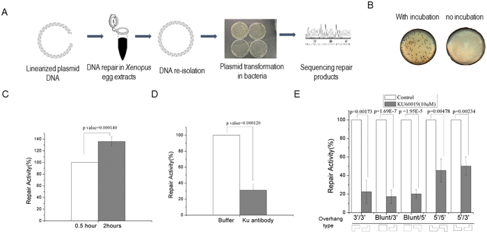 Figure 1. Repair of DSB substrates in Xenopus egg extract.(A) Schematic diagram of the DSB repair assay. As described in Materials and Methods, linearized plasmid DNA was generated and incubated in Xenopus egg extract. Plasmid DNA was then re-isolated from egg extracts, and transformed into bacteria cells. The final repair products were isolated from bacteria colonies and subjected to sequencing analysis. (B) As in panel A, incubation of plasmid DNA linearized with Xho1 and Kpn1 in Xenopus egg extracts led to formation of colonies after bacteria transformation. As a control, mixing the linearized plasmid with egg extracts without incubation did not yield colony formation. (C) As in panel A, the linearized plasmid DNA was incubated in Xenopus egg extracts for 0.5 or 2 hr, re-isolated, and transformed into bacteria cells. The repair activity was measured by colony numbers. (D) The repair assay was performed in Xenopus egg extract that was supplemented with or without Ku70 antibody. The repair activity (in relative to the control extract) was measured by colony numbers. (E) The repair assay was performed in Xenopus egg extract that was supplemented with or without DNA-PKcs inhibitor (NU7441). The repair activity was measured by colony formation and compared between extracts with or without the inhibitor. Five types of repair templates were used, as in Fig. S2. In panels C–E, a minimum of three experiments were carried out and the results are shown as the mean values and standard deviations. Statistical significance was analyzed using an unpaired 2-tailed Student’s t-test. A p-value < 0.05 was considered statistically significant.