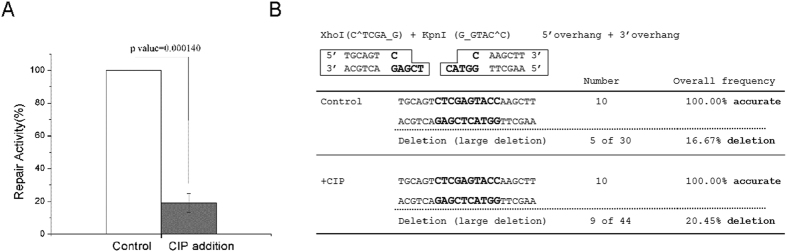 Figure 5. End dephosphorylation reduced the repair efficiency without promoting end resection.(A) The 3′-overhang/5′-overhang template was incubated with calf intestinal alkaline phosphatase (CIP), or control buffer, prior to the addition in Xenopus egg extracts. The repair activity (in relative to the control extract) was measured by colony numbers. A minimum of three experiments were carried out and the results are shown as the mean values and standard deviations. Statistical significance was analyzed using an unpaired 2-tailed Student’s t-test. A p-value0.05 was considered statistically significant. (B) The repair assay with CIP incubation was established as in panel A. Ten final repair products were sequenced and shown. Repair products with large-fragment deletion were determined by agarose gel electrophoresis.
