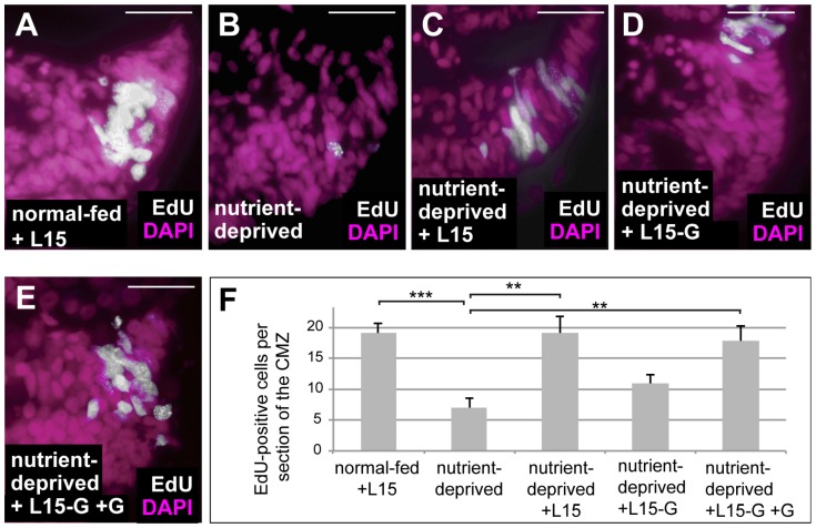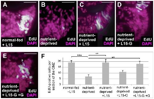 Figure 3. Glutamine is essential for retinal progenitor cell proliferation. (A–E) EdU incorporation in DAPI-stained ex vivo retinal explants from normal-fed embryos maintained in L15 medium for 24 h (A), from ND embryos maintained in 1× MBS for 24 h (B) or from ND embryos re-fed for 24 h with L15 (C), L15 lacking glutamine (D) or L15 lacking glutamine with added glutamine (E). Removal of glutamine from L15 medium prevented the rescue in proliferation observed following re-feeding. (F) Quantification of the experiment performed in (A–F). Error bars are standard deviations between three independent experiments. Two hooked ends of horizontal lines indicate the two conditions compared, ** p-values < 0.01, *** p-value < 0.001; scale bars = 20 μm; n = 3. Each experiment used six retinas per condition. These were from six different animals per condition (i.e., one retina from each animal). |