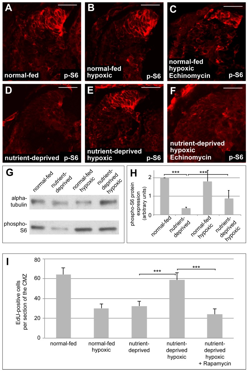 Figure 5. Reactivation of mTOR signalling, mediated by HIF-1 function, is required when nutrient-deprived retinas increase proliferation in hypoxia. (A–D) Immunostaining for the mTOR target phospho-S6 (p-S6) in retinas from normal-fed (A–C) or nutrient-deprived (C–E) animals kept in normal oxygen concentration (A,D), under hypoxia (B,E) or under hypoxia and treated with Echinomycin (C,F). Incubation of nutrient-deprived retinas in hypoxia restores p-S6 staining in the CMZ. Echinomycin treatment interferes with the increase of p-S6 staining in the CMZ of nutrient-deprived hypoxic retinas. Scale bars = 50 µm; n = 3. In each condition, a minimum of 8 retinas was examined. (G) Western blot of retinas dissected from normal-fed or nutrient-deprived normoxic or hypoxic animals, probed for phospho-S6 and α-tubulin. At least 22 retinas were taken for each condition, and all conditions in each experiment have the same number of retinas (n = 10). (H) Quantification of the Western blot shown in (G). Phospho-S6 levels, normalized to tubulin, are significantly reduced upon nutrient deprivation, unaffected by hypoxia alone, and increase to 40% of control levels upon nutrient deprivation in hypoxia. In Western blot quantification, error bars represent standard deviations between 10 independent experiments. Two hooked ends of horizontal lines indicate the two conditions compared, *** p-values < 0.001; n = 10. (I) Quantification of EdU incorporation in retinas from normal-fed or nutrient-deprived animals kept in normoxia, hypoxia or incubated with Rapamycin under hypoxia. Nutrient-deprived retinas no longer resume their proliferation in hypoxia when mTOR signalling is blocked by Rapamycin. Error bars represent standard deviations between two independent experiments. Two hooked ends of horizontal lines indicate the two conditions compared, *** p-values < 0.001; n = 2. For each condition, between 7 and 15 retinas were quantified. |