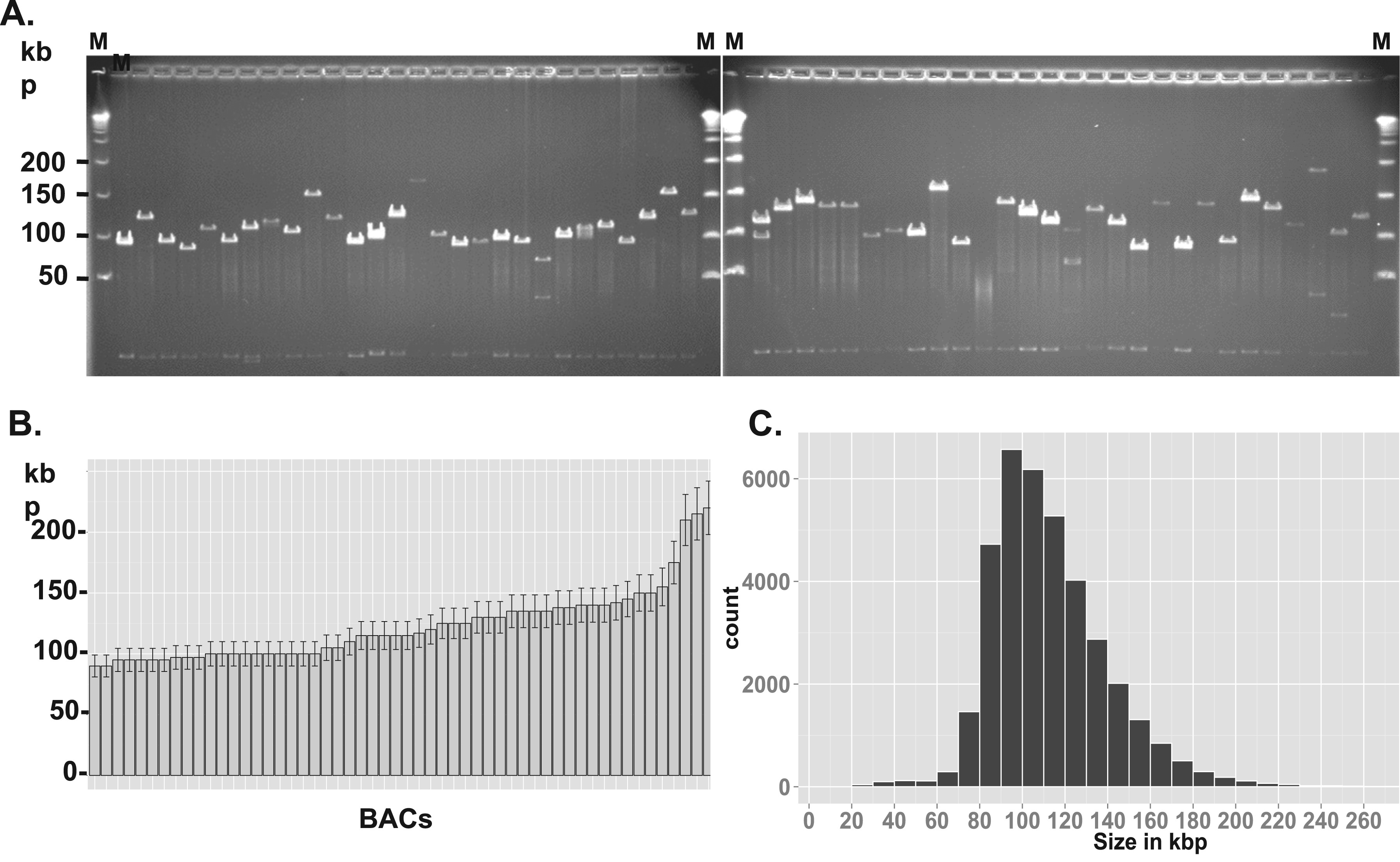 Fig. 1. Evaluation of XTHR BAC insert sizes. (A) Picture of a pulsed-field gel electrophoresis gel on 56 randomly selected BAC clones. Each BAC DNA was digested using NotI before PFGE. M: bacteriophage Lambda DNA concatemers used as molecular weight markers (Bio-Rad). Note the released vector fragment band at the bottom of the gel. (B) Bar-plot representation of 55 BAC insert sizes, sorted by size. Each bar represents the BAC insert size as determined from the gels shown in panel A. The error bar represents 10% of measurement uncertainty. Each bar corresponds to a BAC clone. (C) Frequency distribution of insert sizes determined by the mapping of XTHR BAC end sequences on X. tropicalis genome sequence version 9.