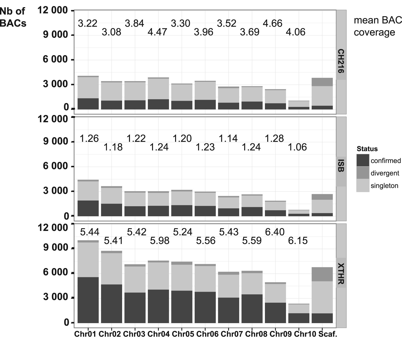 Fig. 2. Evaluation of BAC coverage. This bar plot represents the number of BAC clones mapped to each chromosome either from both ends (confirmed) or from only one end (singleton). Divergent BACs are those for which both ends map to different chromosomes or scaffolds. The numbers indicated above each bar represent the mean BAC coverage of the given chromosome. The results for all scaffolds that are unanchored to the chromosome map are also shown (Scaf.).