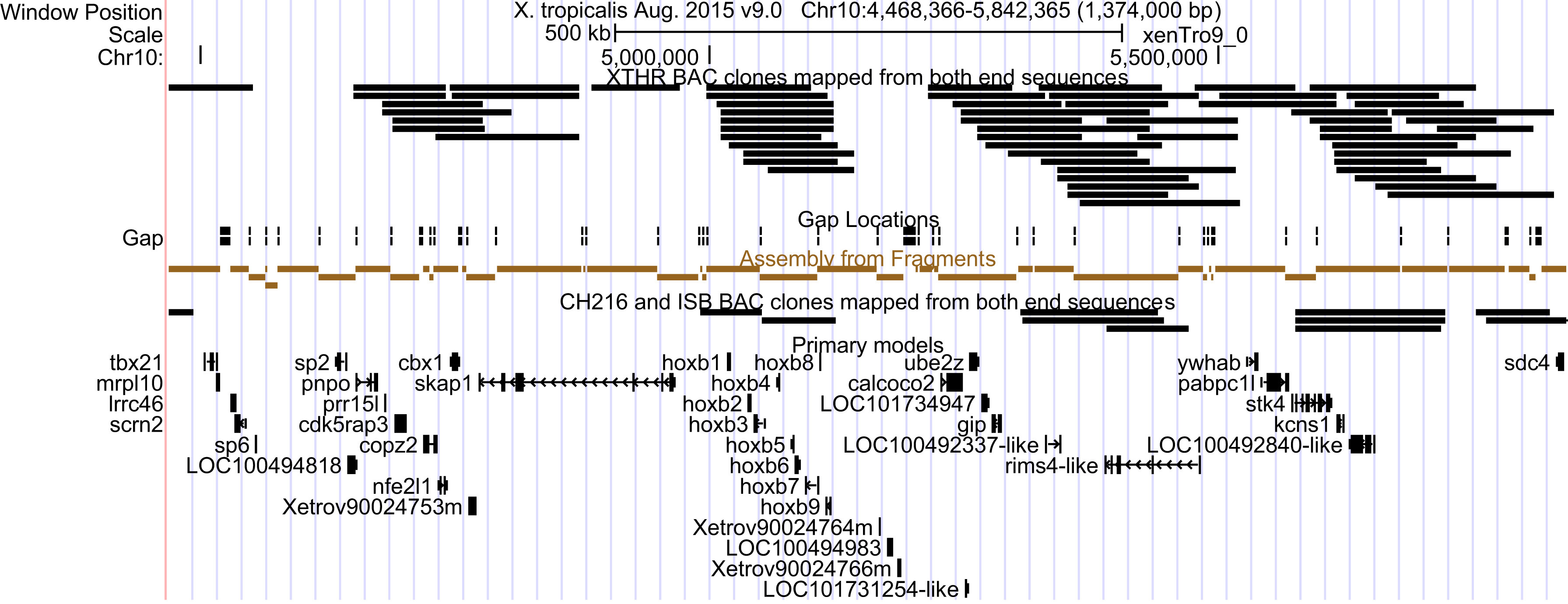 Fig. 3. Example of BAC coverage at the HOXB locus. This screenshot illustrates the BAC coverage on a 1 Mbp locus containing the HOXB cluster. Only confirmed BACs are displayed.