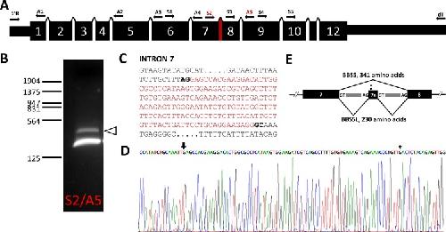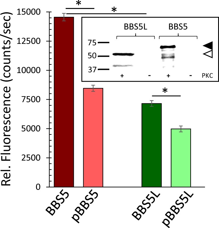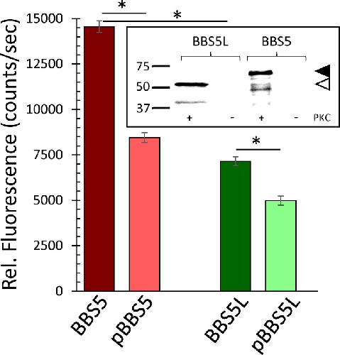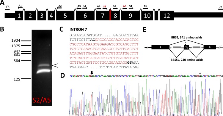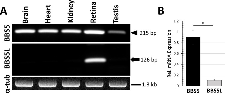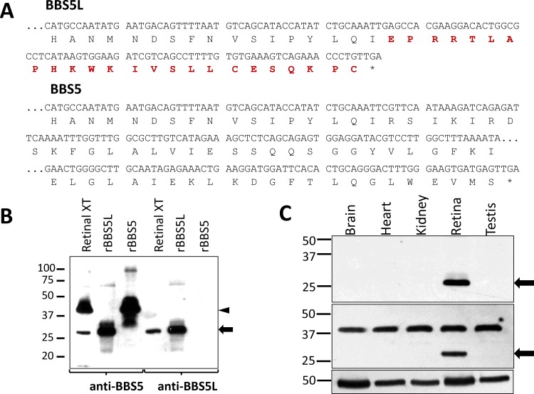 PURPOSE: Bardet-Biedl syndrome is a complex ciliopathy that usually manifests with some form of retinal degeneration, amongst other ciliary-related deficiencies. One of the genetic causes of this syndrome results from a defect in Bardet-Biedl Syndrome 5 (BBS5) protein. BBS5 is one component of the BBSome, a complex of proteins that regulates the protein composition in cilia. In this study, we identify a smaller molecular mass form of BBS5 as a variant formed by alternative splicing and show that expression of this splice variant is restricted to the retina. METHODS: Reverse transcription PCR from RNA was used to isolate and identify potential alternative transcripts of Bbs5. A peptide unique to the C-terminus of the BBS5 splice variant was synthesized and used to prepare antibodies that selectively recognized the BBS5 splice variant. These antibodies were used on immunoblots of tissue extracts to determine the extent of expression of the alternative transcript and on tissue slices to determine the localization of expressed protein. Pull-down of fluorescently labeled arrestin1 by immunoprecipitation of the BBS5 splice variant was performed to assess functional interaction between the two proteins. RESULTS: PCR from mouse retinal cDNA using Bbs5-specific primers amplified a unique cDNA that was shown to be a splice variant of BBS5 resulting from the use of cryptic splicing sites in Intron 7. The resulting transcript codes for a truncated form of the BBS5 protein with a unique 24 amino acid C-terminus, and predicted 26.5 kD molecular mass. PCR screening of RNA isolated from various ciliated tissues and immunoblots of protein extracts from these same tissues showed that this splice variant was expressed in retina, but not brain, heart, kidney, or testes. Quantitative PCR showed that the splice variant transcript is 8.9-fold (+/- 1.1-fold) less abundant than the full-length transcript. In the retina, the splice variant of BBS5 appears to be most abundant in the connecting cilium of photoreceptors, where BBS5 is also localized. Like BBS5, the binding of BBS5L to arrestin1 can be modulated by phosphorylation through protein kinase C. CONCLUSIONS: In this study we have identified a novel splice variant of BBS5 that appears to be expressed only in the retina. The BBS5 splice variant is expressed at approximately 10% of full-length BBS5 level. No unique functional or localization properties could be identified for the splice variant compared to BBS5.