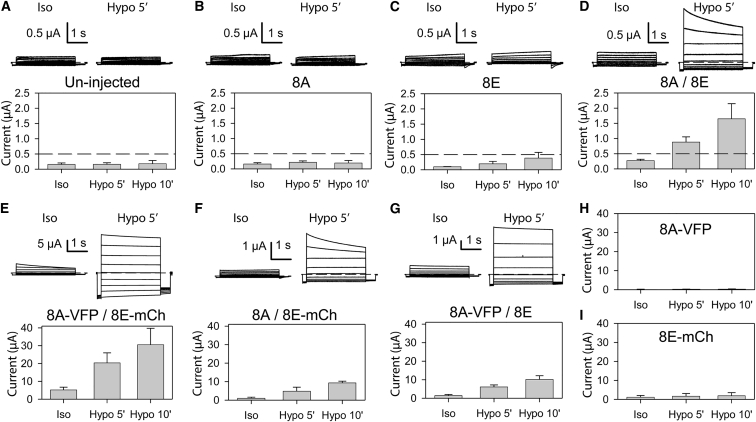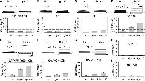 Figure 1. Functional expression of LRRC8-mediated VRAC currents in Xenopus oocytes. (A) Voltage-clamp traces of an uninjected oocyte evoked by the IV-pulse protocol in âIsoâ (A, top left) and after 5 min perfusion of âHypoâ solution (A, top right). Mean values of currents at 60 mV from uninjected oocytes in âIso,â and after 5 min and 10 min in âHypoâ solution (A, bottom) (n = 7). (BâG, top) Currents of single oocytes injected with 8A (B) and 8E (C), and coinjected with 8A/8E (D), 8A-VFP/8E-mCherry (E), 8A/8E-mCherry (F), and 8A-VFP/8E (G) in response to the IV-pulse protocol in âIsoâ solution and after 5 min perfusion with âHypoâ solution. (BâG, bottom) Current at 60 mV of 8A (B), 8E (C), 8A/8E (D), 8A-VFP/8E-mCherry (E), 8A/8E-mCherry (F), and 8A-VFP/8E (G) in âIsoâ and after 5 min and 10 min in âHypoâ solution (n ⥠4). The dashed line in (A)â(D) indicates an arbitrary threshold of current expression corresponding to 0.5 μA. (H and I) Mean values of currents at 60 mV from oocytes injected with 8A-VFP (H) and 8E-mCherry (I) in âIsoâ and after 5 min and 10 min in âHypoâ solution (n ⥠4). Error bars indicate the standard deviation. |