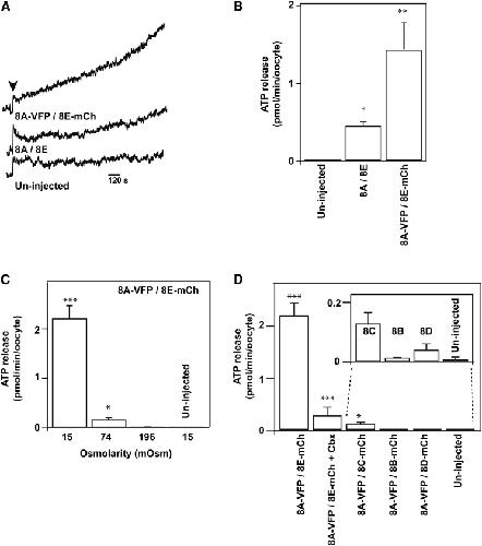Figure 5. ATP release through LRRC8 proteins. (A) ATP-release representative traces of uninjected oocytes (bottom), oocytes injected with 8A/8E (middle), and oocytes injected with 8A-VFP/8E-mCherry (top). The black arrowhead indicates the beginning of the hypotonic exposure (15 mOsm). (B) Amount of ATP released (pmol/oocyte/min) from uninjected oocytes (n = 4), oocytes injected with 8A/8E (n = 5) and oocytes injected with 8A-VFP/8E-mCherry (n = 5). (C) Amount of ATP released from oocytes injected with 8A-VFP/8E-mCherry incubated in solutions with different osmolarities, 15 (n = 6), 74 (n = 4), and 196 (n = 4) mOsm, or from uninjected oocytes at 15 mOsm (n = 4). (D) Amount of ATP released in hypotonic conditions from oocytes injected with 8A-VFP/8E-mCherry (n = 6), 8A-VFP/8E-mCherry in the presence of 100 μM CBX (n = 5), 8A-VFP/8C-mCherry (n = 4), 8A-VFP/8B-mCherry (n = 4), 8A-VFP/8D-mCherry (n = 4), and uninjected oocytes (n = 4). Data indicate the mean ± SE. âp < 0.05, ââp < 0.01, âââp < 0.001. |