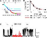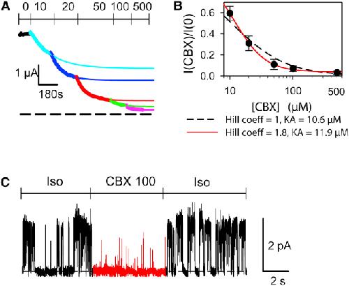 Figure 6. Carbenoxolone inhibition of 8A-VFP/8E-mCherry. (A) Currents recorded in voltage clamp at 60 mV are plotted as function of the time. Colors correspond to the different CBX concentrations (10, 20, 50, 100, 500 μM) applied during the experiment. In order to estimate the steady-state effect, single-exponential functions were fitted to the time course and extrapolated to infinite time (solid colored lines). (B) Concentration dependence of CBX modulation of hLRRC8A-VFP/8E-mCherry. Currents acquired at 60 mV are normalized to values measured in “Iso” solution and plotted versus CBX concentrations. The red line represents the best fit of hLRRC8A-VFP/8E-mCherry currents (fit parameters: Hill coefficient = 1.8, KA = 11.9 μM, p∞ = 0.038), while the black dashed line (fit parameters: Hill coefficient = 1.0, KA = 10.6 μM, p∞ = 0) poorly fits the data. These theoretical predictions are obtained using Eq. 3 as described in Methods. (n ≥ 8, except for 50 μM, where n = 4). (C) Representative trace from an outside-out patch at 80 mV in “Iso” solution (black), 100 μM CBX (red), and wash in “Iso” solution (black). Error bars indicate SD. To see this figure in color, go online. |