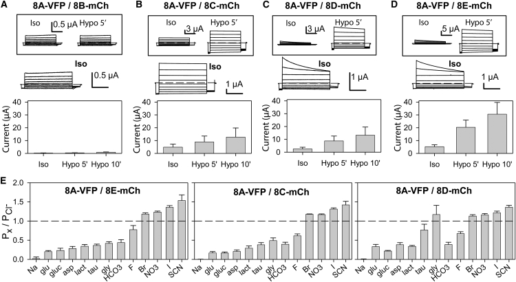 Figure 8. Osmolarity dependence of 8A-VFP/8E-mCherry. Left: currents at 60 mV are plotted vs. time. Colors correspond to the different extracellular osmolarities applied (200, 310, 120 mOsm); additionally, CBX was applied to test the endogenous current contribution. Right: quantification of the osmolarity dependence of 8A-VFP/8E-mCherry. Currents at 60 mV recorded at osmolarity values between 40 and 310 mOsm are normalized to the currents measured in âIsoâ solution (200 mOsm). Error bars indicate SD (n ⤠5). To see this figure in color, go online. |