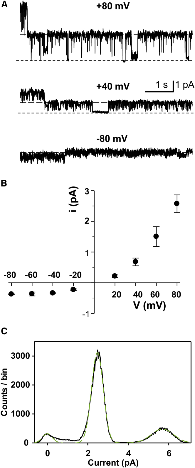 Figure 3. Single-channel studies of the 8A-VFP/8E-mCherry heteromer. (A) Representative traces from a cell-attached patch at 80, 40, and −80 mV. (B) Single-channel current-voltage relationship. Mean single-channel currents are plotted versus the corresponding potentials ranging between −80 and 80 mV. Note the outward rectification (n ≥ 4) For −80, −40, and −20 mV, n = 2). Error bars indicate the standard deviation. (C) Amplitude histogram of the recording at 80 mV in control conditions. The dashed line represents the fit with a sum of three Gaussians. The dominant current level has an amplitude of 2.5 pA. To see this figure in color, go online. |