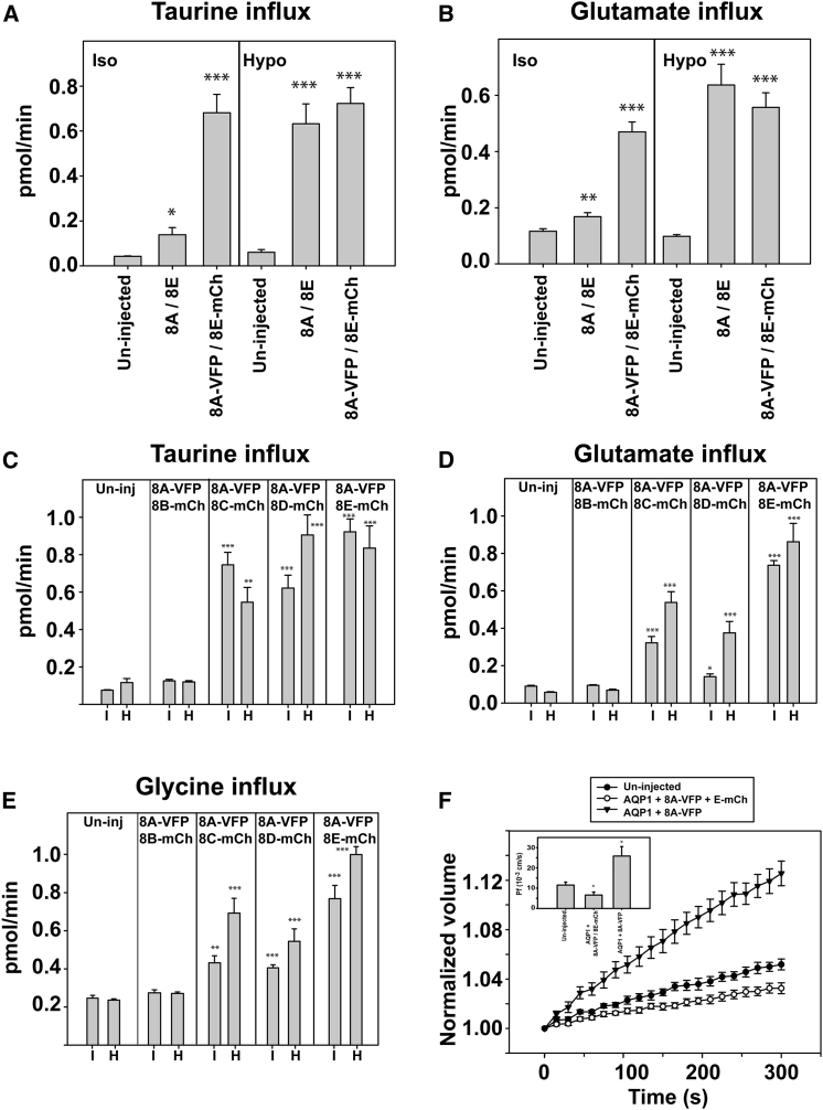 Figure 4. Uptake of osmolytes through LRRC8 proteins in Xenopus oocytes. (A and B) Comparison of the mean values of taurine (A) and glutamate (B) uptake between uninjected (n ⥠6) oocytes, oocytes injected with nontagged 8A/8E (n ⥠5) and oocytes injected with fluorescent-tagged 8A-VFP/8E-mCherry (n ⥠6) in âIsoâ solution (left) and âHypoâ solution (right). (CâE) Comparison of the mean values of taurine (C), glutamate (D), and glycine (E) uptake between uninjected oocytes and oocytes injected with 8A-VFP co-expressed with 8B-mCherry, 8C-mCherry, 8D-mCherry, and 8E-mCherry (n ⥠3 for all co-expressions) in Iso âIâ and Hypo âHâ solution. (F) Time course of normalized oocyte volume in ND48 solution and apparent water permeability mean values (inset) of uninjected oocytes (n = 6), AQP1 + 8A-VFP (n = 8), and AQP1 + 8A-VFP/8E-mCherry (n = 10) injected oocytes. Data indicate the mean ± SE. âp < 0.05, ââp < 0.01, âââp < 0.001. |