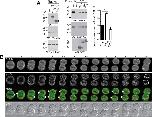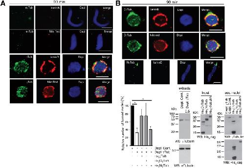 Fig. 20. The N-terminal region of γ-tubulin leads to the formation of chromatin-empty nuclei. (A) DIC/fluorescence images of time-lapse from a U2OS cell that is stably expressing both γTUBULIN shRNA and sh-resistant N-γtubGFP1–333 (NTerm, green), and transiently expressing mCherry-lamin B1 (lamB1; red) with Hoechst 33258 stained chromatin (blue), as indicated. The image series show the location of N-γtubGFP1–333 and lamin B1 in a mitotic cell that during nuclear assembly transiently formed two nuclear-like structures, which lack chromatin (arrowhead and arrow). Chromatin-lacking nuclear-like structures (white borders) are shown on the right images. Graph shows the percentage of filmed cells that formed chromatin lacking nuclear like structures. Images were collected every 30 sec. See also movie S5. (B) Fixed U2OS cells that are stably expressing γTUBULIN shRNA and N-γtubGFP1–333 were immunofluorescence stained with an anti-lamin B antibody (laminB; red) and nuclei were detected with DAPI (blue). (A, B) Scale bars, 10 μm. |